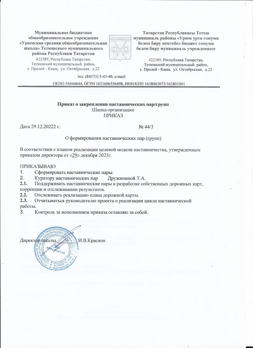 Приказ о закреплении наставнических пар/групп