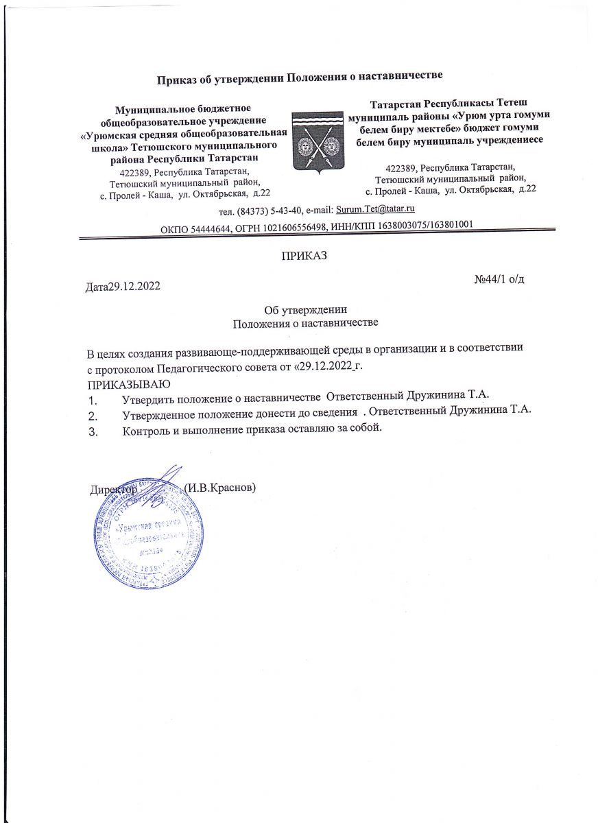 Приказ от 29.12.2022 г. Об утверждении Положения о наставничестве
