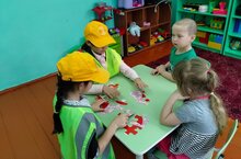 С целью закрепления знаний о правилах дорожного движения ЮИДовцы совместно с воспитанниками дошкольной группы поучаствовали в игре "Собери дорожный знак". Правила игры: правильно собрать пазл, озвучить его название, назначение, цвет и форму.
