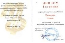 Учащиеся 6 класса Мустафина Чулпан и Мустафин Ильсур, ученица 8 класса Хасанова Алина стали победителями XX Межрегиональной заочной физико-математической олимпиады среди учащихся 5-8 классов. Олимпиада проводилась в ноябре-декабре 2013 года, а результаты были получены по почте только в марте. Все победители получили Дипломы I степени и приглашения на обучение в заочном физико-математическом лицее «АВАНГАРД».