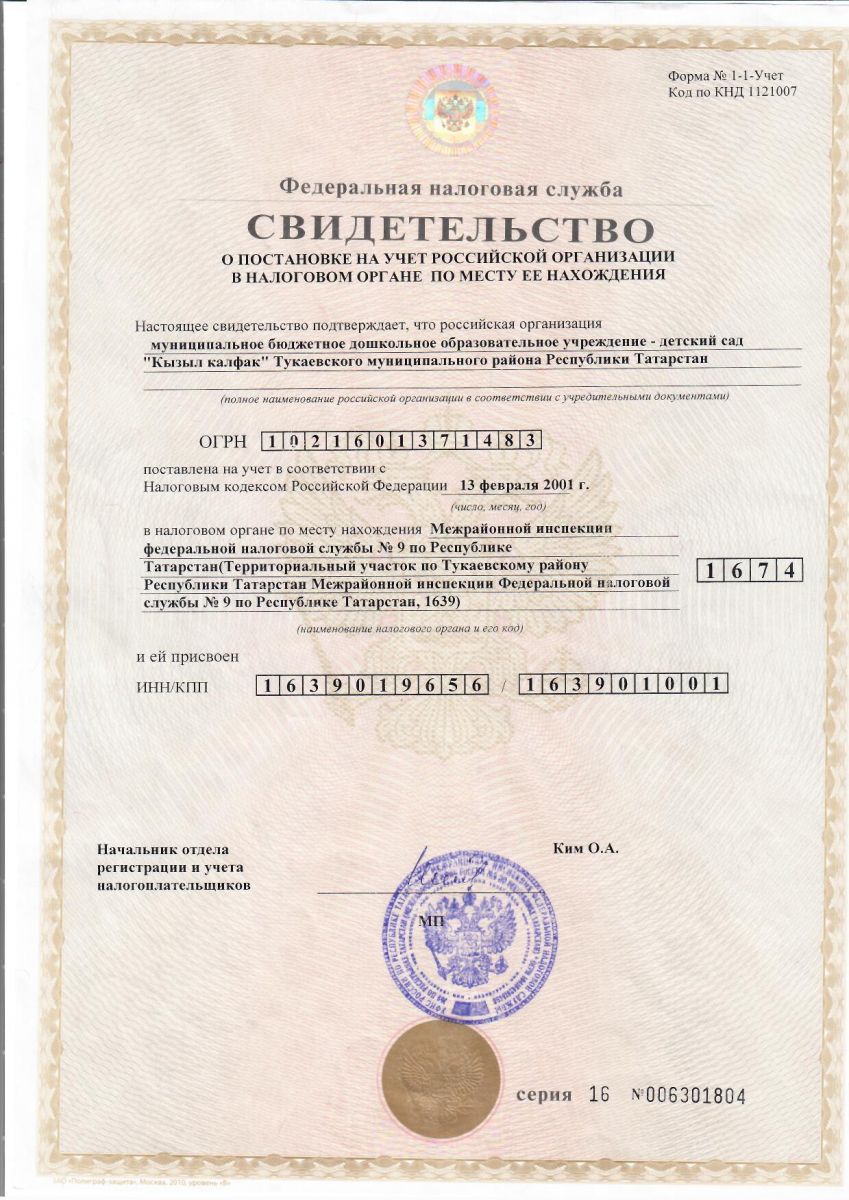 Свидетельство о постановке на учет в налоговом органе МБДОУ