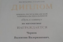 Поздравляем!!! 11.01.2018 Поздравляем Чернова Валентина с победой! Валентин принял участие в заключительном этапе республиканской олимпиады школьников 6-11 классов «Путь к олимпу» по математике. По итогам олимпиады Валентин был награжден Дипломам Мои Н РТ.