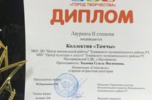 Коллектив театра" Тамчы", приняв участие в открытом республиканском конкурсе" Город Творчества", посвященном 75-летию Победы в Великой Отечественной войне, 100-летию со дня рождения ТАССР, по праву стал лауреатом ll -степени. /