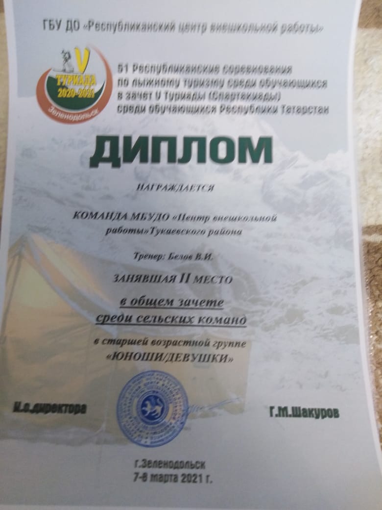 Опубликовано: 09.03.20217-8 марта 2021 года на базе ГАУ «Спортивный комплекс «Маяк» Зеленодольского муниципального района прошли 51-е Республиканские соревнования по лыжному туризму среди обучающихся в зачет V Туриады (Спартакиады) среди обучающихся Республики Татарстан. Команды МБУДО «Центр внешкольной работы» Тукаевского муниципального района под руководством Белова Виктора Ивановича заняли 2 и 3 призовые места.