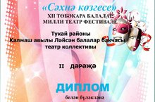 Тукай районы Калмаш авылы "Ләйсән" балалар бакчасы театр коллективы "Сәхнә көзгесе" төбәкара балалар милли театр фестивалендә катнашып 2 дәрәҗә диплом белән бүләкләнде. Сабыйларга һәм театр җитәкчеләренә киләчәктә зур уңышлар, яңадан -яңа җиңүләр теләп калабыз!