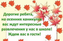 Осенние каникулы с 31 октября по 6 ноября! Ребята приходите в школу в дни осенних каникул на мероприятия, которые для ВАС подготовили наши учителя.