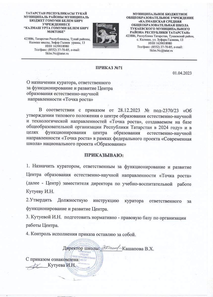 Приказ О назначении куратора Центра образования "Точки роста" в МБОУ "Калмашская СОШ"