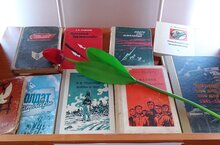 Тематическая выставка литературы в школьной библиотеке "Для нас они живы"