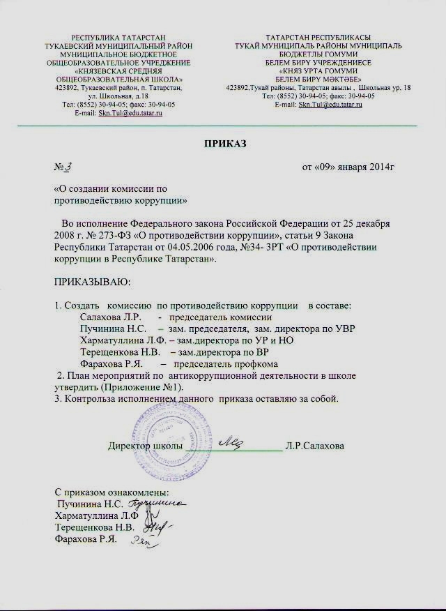 Приказ управления образования "Об усилении мер по предупреждению коррупционных правонарушений в образовательных учреждениях Тукаевского муниципального района" от 5.08.2014