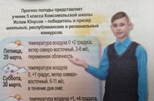 Ученик 5 класса Юнусов Ислам на этой неделе представил в газете "Светлый путь" прогноз погоды. Он удостоен этой чести и мы его поздравляем!