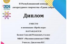 Ученик 6 "А" класса Беляев Савелий занял 3 место в номинации "Проба пера" по тематике "Как славен человек делами" во II Республиканском конкурсе литературного творчества "Грани добра-2024"! Молодец! Желаем Савелию дальнейших творческих высот!