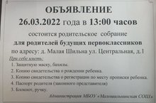 26.03.2022 года в 13:00 часов состоится родительское собрание для родителей будущих первоклассников по адресу: д. Малая Шильна ул. Центральная, д.1