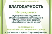 Наша школа была награждена грамотой за проведение Всероссийского заповедного урока "Заповедные острова. Сохраняя будущее".