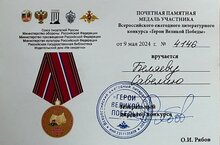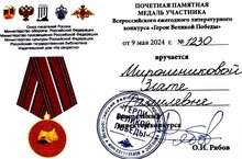 Награждение Почётной медалью Всероссийского ежегодного литературного конкурса "Герои Великой Победы" 15.06.2024