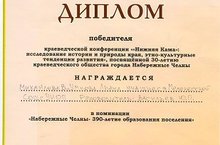 Ученица 11 класса Михайлова Валерия награждена Дипломом победителя краеведческой конференции "Нижняя Кама", посвященной 30-летию краеведческого общества города Набережные Челны.