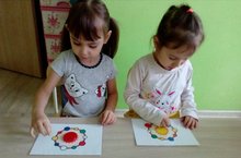Дети выкладывают пуговицы на круги вокруг бубна соответствующих цветов и размеров. Игра развивает внимание, формирует представление о цвете, форме и величине.