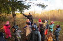 Дети и воспитатели старшей - подготовительной группы отправились в путешествие в лес. Гуляя по лесным тропинкам, они наблюдали за птицами, наслаждались осенним разноцветьем. Вернулись дети и взрослые в детский сад с полными корзинками желтых листьев.