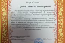 За креативный подход и помощь в расширении форм социального партнерства в вопросах профилактики детского дорожно-транспортного травматизма награждена грамотой заведующий Гусева Т.В. от начальника отдела ГИБДД отдела МВД России по Тукаевскому района Ганиева Ш.М.