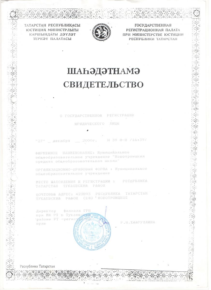 Муниципальное бюджетное общеобразовательное учреждение «Новотроицкая средняя общеобразовательная школа» Тукаевского муниципального района Республики Татарстан/ Татарстан Республикасы Тукай муниципаль районы "Новотроицк урта гомуми белем бирү мәктәбе" гомуми белем бирү муниципаль бюджет учреждениесе