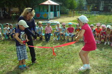 Сегодня в детском саду прошло спортивное развлечение "Быть здоровым я хочу!". Появление Незнайки обрадовало ребятишек. Дети активно принимали участие во всех играх и эстафетах.