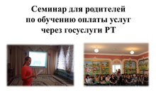 Сегодня в детском саду прошел семинар для родителей по обучение оплаты услуг через госуслуги РТ (оплата услуг ЖКХ, подача заявлений в детский сад, оплата начислений за родительскую плату)