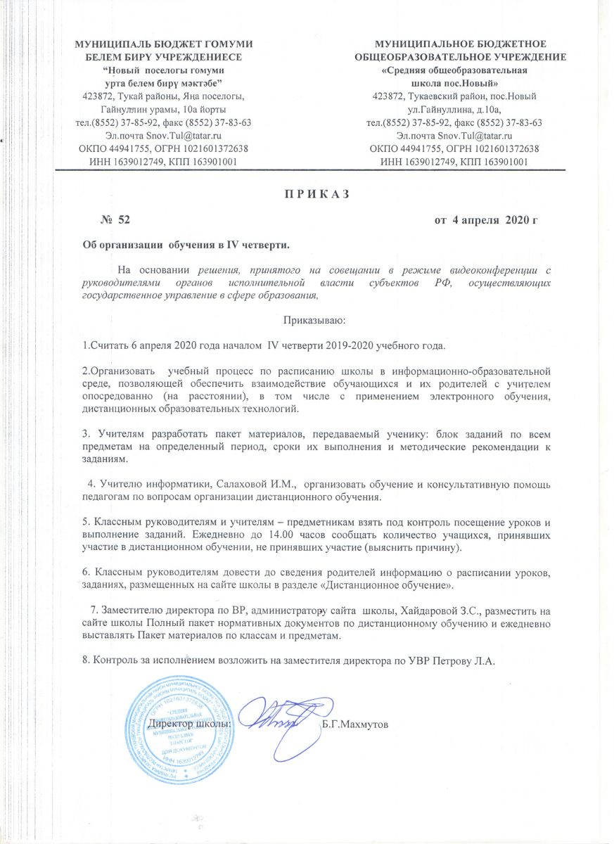 Приказ от 04.04.2020 №52 "Об организации обучения в IV четверти"