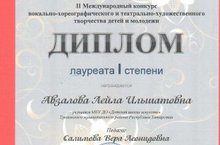 Поздравляем Авзалову Лейлу - Лауреат 1 степени, преподаватель Салимова В.Л.