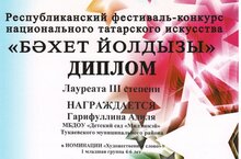 Поздравляем нашу воспитанницу Гарифуллину Адилю в с победой в Республиканском фестиваль конкурсе национального татарского искусства "Бэхет йолдызы" .