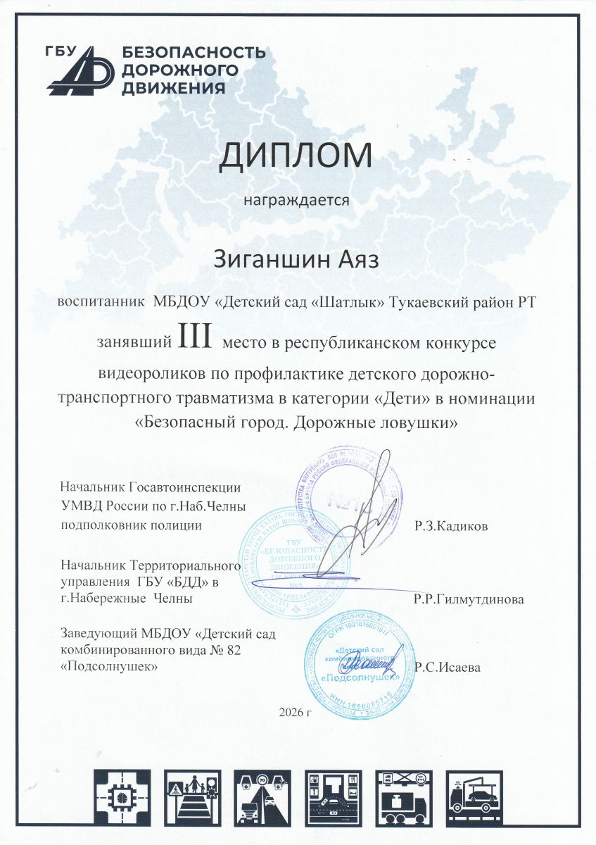 Мы снова одержали победу. Поздравляем нашего воспитанника Аяза Зиганшина, его родителей и коллектив детского сада с третьим местом в республиканском конкурсе видеороликов по профилактике детского дорожно-транспортного травматизма. Конкурс проходил в категории «Дети» и номинации «Безопасный город. Дорожные ловушки». Мы гордимся талантом наших детей и воспитателей. Отдельно благодарим фельдшера Кувадинского ФАП Аделю Ирековну Сакаеву за участие в нашем проекте.