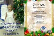 Воспитанница подготовительной группы Андреева Есения приняла участие во Всероссийском конкурсе чтецов «Поет зима, аукает», рассказав стихотворение «Горит огнями елочка…», и заняла почетное второе место. Поздравляем и руководителей Садикову ЗН. И Иванову Р.Г. Желаем дальнейших побед!