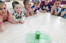 Во второй младшей группе «Малыши» педагог Чернова В.Е. провела эксперимент «Цветной вулка». Этот зрелищный эксперимент привел в восторг малышей.