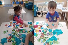 Пазлы относятся к одним из лучших развивающих игр и занятий. Воспитаники первой младшей группы «Капельки» очень любят эту увлекательную игру. Ребята с большим интересом собирают пазлы, проявляя при этом терпение и усидчивость. Ребята учатся классифицировать предметы и называть их одним словом: одежда, обувь, мебель, посуда. Играя в пазлы у детей развиваются внимание, память, мышление, мелкая моторика, также малыши учатся взаимодействию друг с другом, умению уступать и не ссорится.