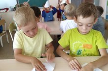 Воспитанники разновозрастной группы вместе с воспитателем Маннановой Э.Г. сегодня учились выполнять оригами " Собачка".