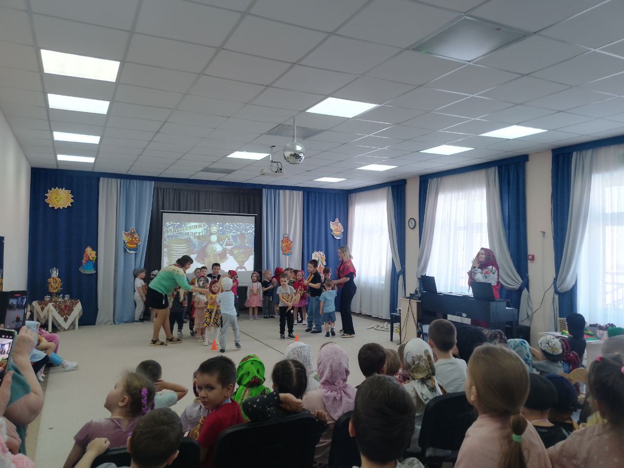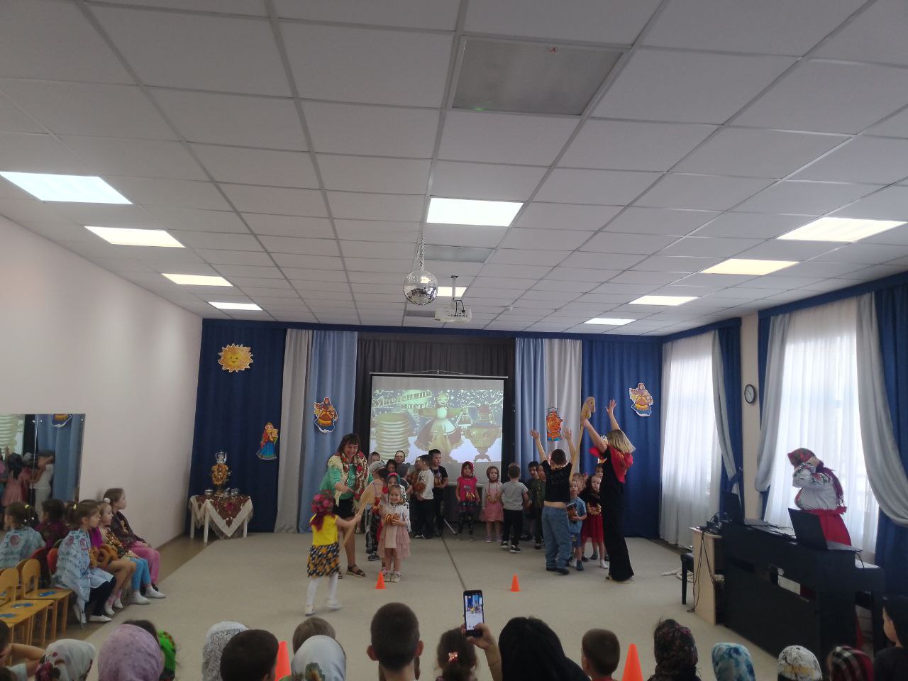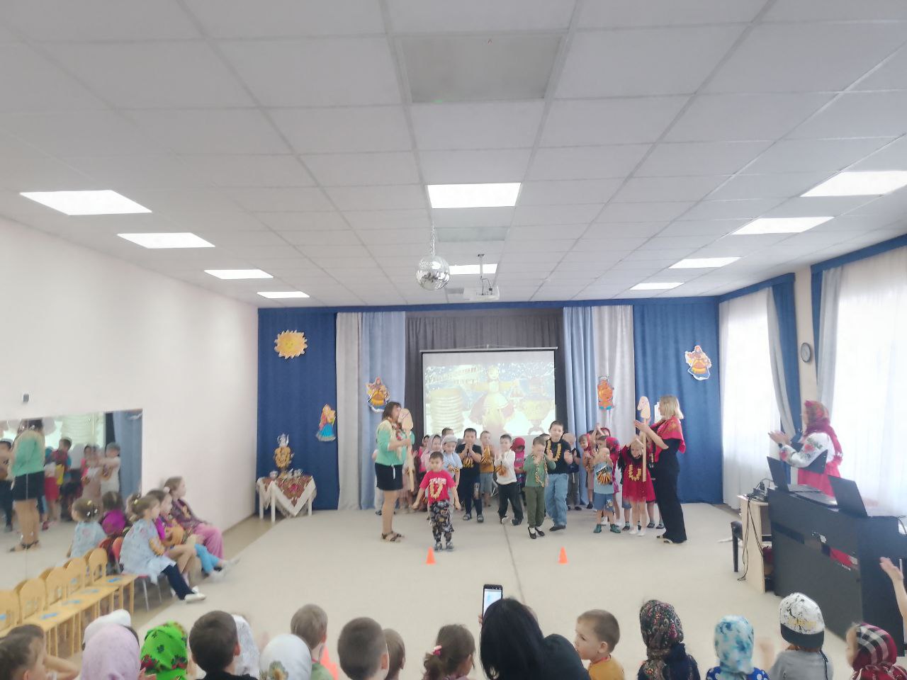 В гости к ребятам пришла настоящий сказочный персонажи - Масленица. Вместе с ней ребята играли в веселые и активные русские народные игры, эстафеты «Катание на лошадях», «Перенеси блинчики», перетягивание каната. Так же дети разгадывали загадки, пели песни, танцевали. Масленица провела танцевальные флешмобы «Блинчик», «Месим, месим тесто». Дети атиквно всеми играми, танцами и песнями закликали Весну-красну. И чудо случилось — Весна услышала! А в знак наступления тепла сама Масленица угостила всех ребят румяными, золотистыми блинами.