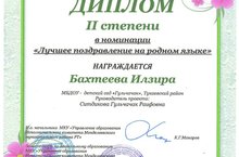 Воспитанница МБДОУ-детского сада "Гульчачак" Бахтеева Илзира награждена дипломом II степени в номинации "Лучшее поздравление на родном языке" в IV Региональном конкурсе видео поздравлений детей дошкольного возраста "Мама-солнышко моё!" 29.11.2017