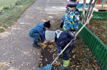 Уборка участка с детьми старшей – подготовительной группы от сухих веток, листьев деревьев и кустов.