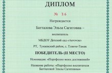 Воспитатель нашего детского сада Батталова Эльза Сагитовна приняла участие во Всероссийском творческом конкурсе «Фея мира детства-3» . В номинации «Портфолио моих достижений» стала победителем (II место). Поздравляем и желаем успехов в работе.