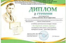 Ученица 2 класса Гайнутдинова Зиля (рук.Харисова Э.К.) была награждена дипломом 3 степени за победу в региональном конкурсе чтецов “За строкой летит строка”, посвящённом 116-летию со дня рождения татарского поэта-героя Мусы Джалиля. Поздравляем!
