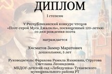 Воспитанник старшей группы Хисматов Замир стал победителем V республиканского конкурса чтецов "Поэт-герой Муса Джалиль", посвящённый 120-летию со дня рождения поэта. Замир также принял активное участие в Международном литературном конкурсе "Джалиловские чтения". Поздравляем Замира и желаем дальнейших успехов!