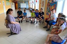 18 июньдә МББУ-Алан урта мәктәбенең "Акчарлак" лагеренда Теләче районының "Родник" халыкка социаль хезмәт күрсәтү үзәге хезмәткәрләре белән очрашу булды. "Кече мәктәп укучыларын патриотик тәрбияләү"темасына белем бирү әңгәмәсе бик кызыклы оештырылды