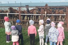 С целью закрепления полученных знаний, по пройденной теме «Домашние животные», развития познавательной активности и воспитания бережного отношения к животным, в средней группе была организована поездка на коневодческую ферму С. Гиниятуллина. В ходе экскурсии мы повторили с детьми знания о лошадях и узнали кое-что нового.Чем лучше питание и уход, тем крупнее становится лошадь. Размер лошади также зависит от ее породы. На данной ферме есть татарские, арабские и английские породы лошадей. Некоторые из них настоящие спортсмены, которые участвуют в различных соревнованиях и привозят награды. Ребятам запомнилась кобыла с очень необычной окраской (мастью) по прозвищу Айсинг – Маннока, у него больше всего наград.Есть большие лошади – тяжеловозы. Они перевозят тяжелые грузы. Есть совсем маленькие лошади – пони.Также проговорили и о применении лечебного метода – иппотерапии, который основан на взаимодействии человека с лошадью.Заглянули мы и в конюшни, узнали, чем кормят лошадей, как за ними ухаживают и содержат.В одном из вольеров мы увидели маленького жеребенка молочного цвета, ребята прозвали его «Сгущенкой». Дети были очень удивлены тем, что жеребята тоже болеют и им также делают уколы и запрещают «гулять». На прощание ребята пожелали ему скорейшего выздоровления и угостили морковкой. Дети получили огромное удовольствие от экскурсии и вернулись в садик со счастливой улыбкой на лице.