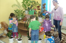 Бүлмә гөлләрен үстерү./ Выращивание комнатных растении. 11.08.2015 Туган якның кайбер үсемлекләре турында зурлар төркемендәге балалар белән кузаллау формалаштырылды. Чәчәкләре һәм ачык беленеп торган башка үченчәлекле билгеләре (яфрак формасы, чәчәк төсе) буенча берничә бүлмә гөленең исемнәре белән таныштылар. Бүлмә гөлләрен танып әйтә белү күнекмәләре ныгытылды. Үсемлеккә үсү өчен җир, су һәм һаваның кирәк булуын балаларга өйрәтелде.