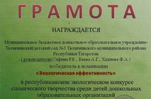 Теләче 3 нче номерлы балалар бакчасы педагоглары Сафина Р.К., Баева А. Г., Һадиева Ф. Г. «Экологик нәтиҗәлелек» номинациясендә җиңүче грамотасына лаек булдылар. Хезмәттәшләребезне котлыйбыз һәм киләчәктә дә иҗади уңышлар телибез.