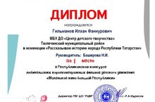 Обучающиеся Центра детского творчества, под руководством педагога дополнительного образования Башировой Нурии Ильдусовны, Гильманов Илхан занял 1 место, Гилазова Тансылу - 2 место, Фатхуллина Залия –сертификат за участие в Республиканском конкурсе любительских короткометражных фильмов детского движения «Маленькое кино большой Республики», в номинации «Рассказываю историю народа Республики Татарстан». Башировой Нурии Ильдусовне вручено Благодарственное письмо.