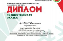Балалар иҗат үзәге укучысы Мэхмүтова Диләрә (җитәкчесе Мәхмүтова Зөлфия Шамил кызы) "Рождественская сказка" диеп исемләегән XI Халыкара балалар һәм яшьүсмерләр сәнгать конкурсында катнашып 2 дәрәҗә Диплом һәм "Остров Сокровищ" күнел ачу үзәгенә купон белән буләкләнде.