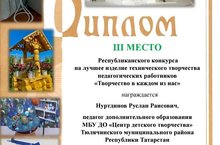 Балалар иҗат үзәгенең өстәмә белем бирү педагогы Нуртдинов Руслан Раисович педагогик хезмәткәрләрнең иң яхшы эшләнмәсе “Һәрберебездә дә иҗат” республика конкурсында, “Станокларның гамәлдәге модельләре, стандарт булмаган җиһаз үрнәкләре” номинациясендә 3 нче урынны алды. -