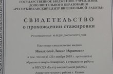 30 ноября директор Центра детского творчества Махмутова З.Ш. успешно защитив проект получила удостоверение по итогам курсов повышении квалификации, который был организован ГАОУ ДПО «Институт развития образования Республики Татарстан» в период с 23 апреля по 30 ноября 2018 года по программе «Современные технологии управления образовательной организацией дополнительного образования детей и взрослых» (по итогам кадрового аудита).