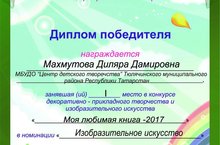 Обучающаяся объединения «Волшебная паутинка» Центра детского творчества Махмутова Диляра Дамировна, под руководством педагога дополнительного образования Галимзяновой Фании Габдулхаковны, заняла 1 место в конкурсе декоративно-прикладного творчества и изобразительного искусства «Моя любимая книга – 2017», в рамках международного творческого проекта «Как прекрасен этот мир».Балалар иҗат үзәгенең “Серле пәрәвез” түгәрәгенә йөрүче Махмутова Диләрә Дамир кызы, өстәмә белем бирү педагогы Галимзянова Фәния Габдулхак кызы җитәкчелегендә, “Минем яраткан китабым – 2017” дип исемләнгән рәсем һәм кул эшләре конкурсында катнашып 1 урынга лаек булды. -