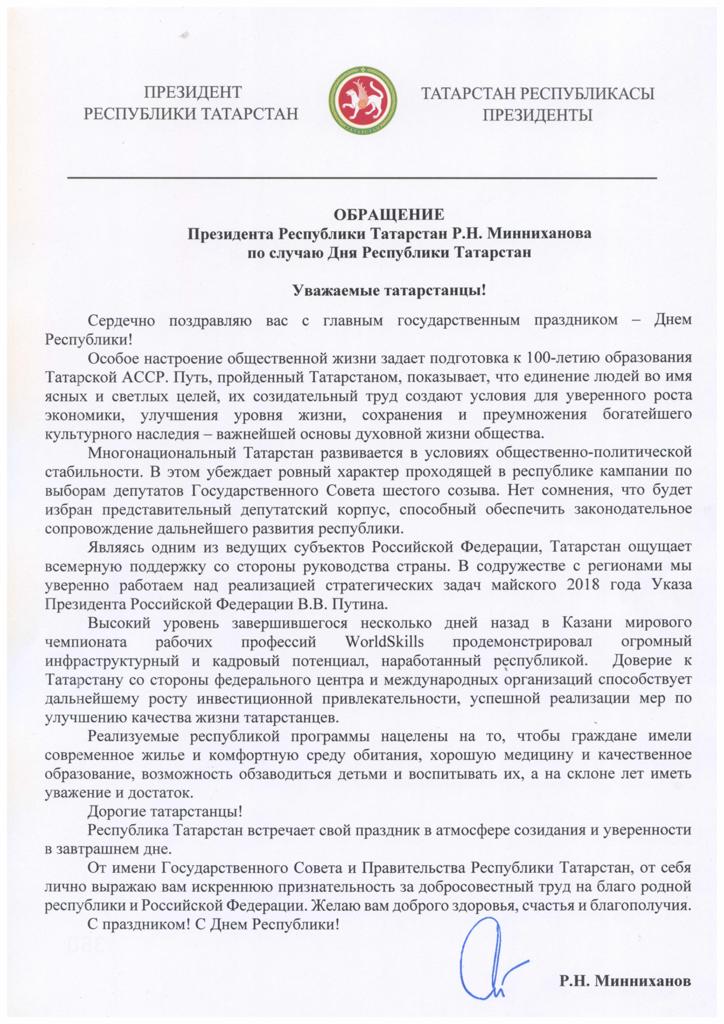 Обращение Президента Республики Татарстан Р.Н.Минниханова по случаю Дня Республики Татарстан
