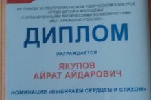 Ученик 9 класса Тюлячинской средней школы Якупов Айрат участвовал в VI Республиканском творческом конкурсе среди детей и молодежи с ограническими физическими возможностями здоровья. -